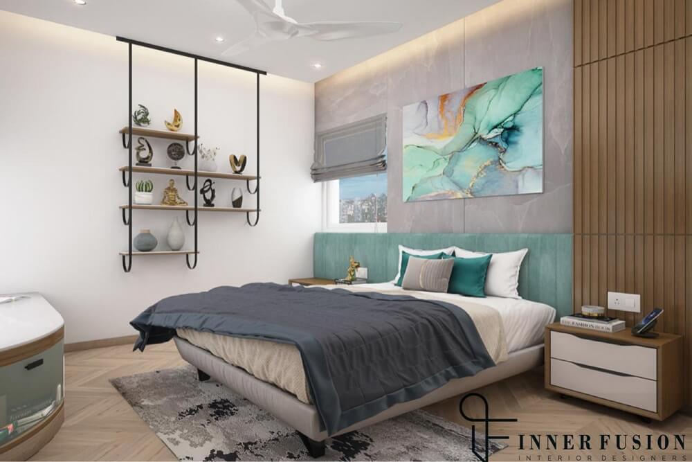 Bedroom of a young couple filled with warmth, series of space and keeping with the idea ‘less is more.’